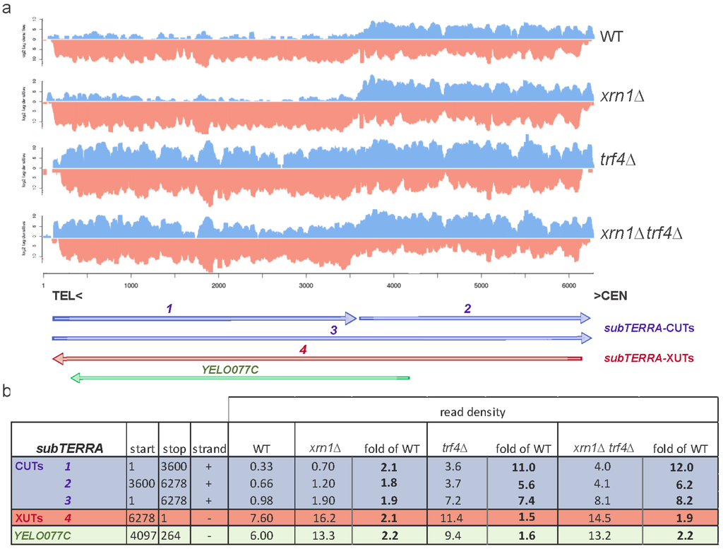 Quantity of subTERRA-CUTs is strongly increased in trf4∆ mutants (11-fold for transcripts 1 and 5.6 to 7.6-fold for transcripts 2 and 3; Figure 2b). subTERRA-XUTs are mostly transcribed toward telomeres, they are already present at high level in the WT strain but still accumulate in xrn1∆ strain (2.1-fold increase; Figure 2b). There is a moderate 1.5/1.9-fold enrichment of subTERRA-CUTs and subTERRA-XUTs in xrn1∆ and trf4∆, respectively.