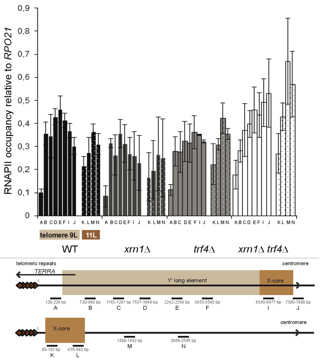 To address the level at which subTERRA is regulated, we asked whether high levels of steady-state subTERRA in RNA decay pathways mutants are due to RNA synthesis or degradation. To distinguish between these possibilities, we performed RNAPII-ChIP experiments scanning subtelomeric regions (Figure 3). Cross-linked chromatin was extracted from wild type strain and RNA decay mutants xrn1∆ trf4∆ and xrn1∆ trf4∆. RNAPII levels were measured by qPCR and normalized with RNAPII quantity at the RPO21 gene. Figure 3 shows that RNAPII occupancy remained constant in the tested mutants, suggesting that the main regulation of subTERRA is post-transcriptional. That was confirmed in alpha-factor-synchronized cells, arrested in G1 phase when subTERRA levels increased but not RNAPII (at START point G1/S transition, at 1N DNA content; Figure S3). These findings support that subTERRA levels are mainly controlled by RNA degradation activities.