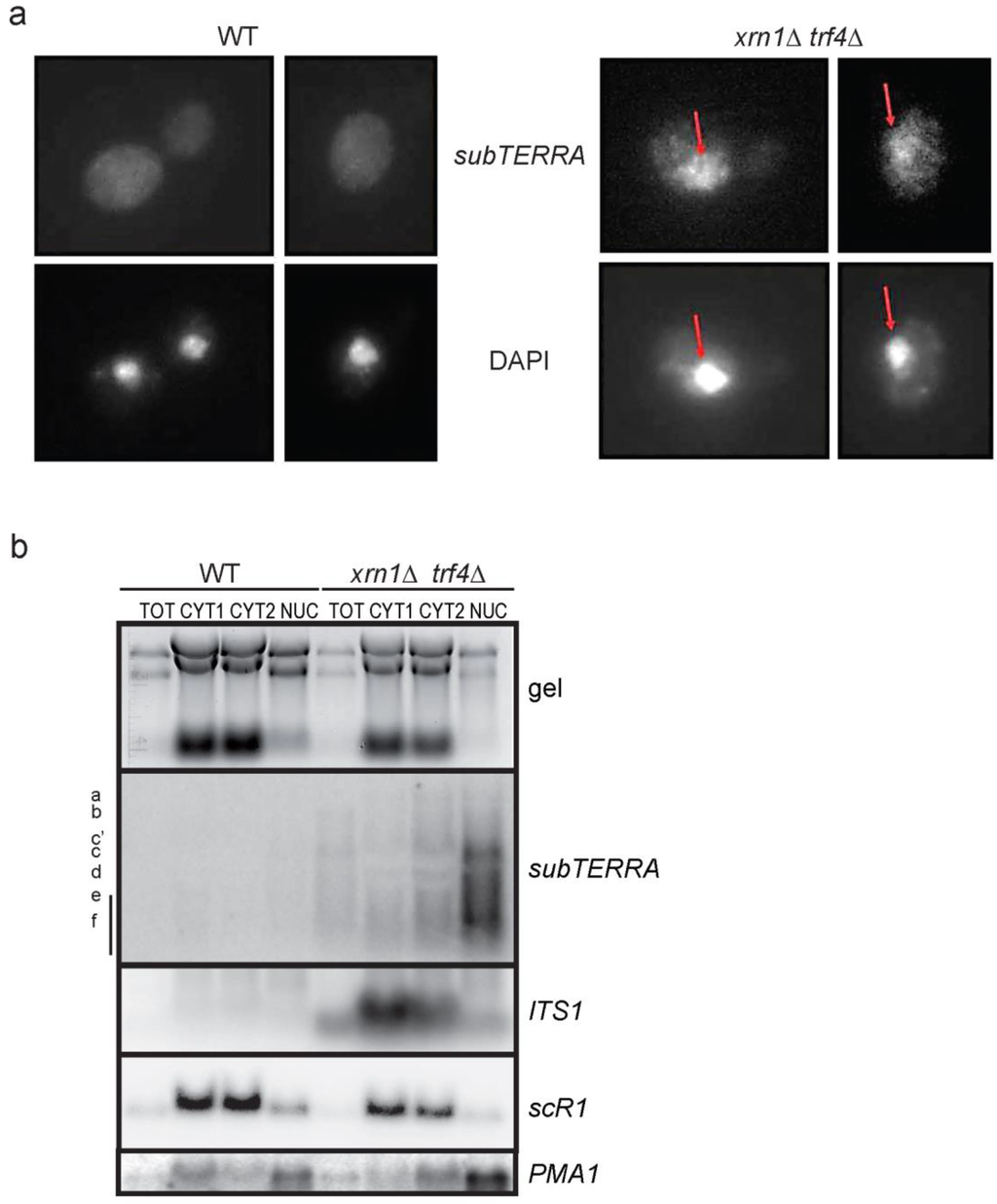 subTERRA localize to the nucleus. (a) FISH with labeled probes detection of Y′ subtelomeric region (upper panel) and DAPI staining for nuclear DNA detection. Representative cells for WT (W303) strain with no subTERRA-specific signals (experiment was representative for biological triplicate). In xrn1∆ trf4∆ specific subTERRA signals co-localize with DAPI staining; (b) subTERRA were detected almost exclusively in nuclear fraction. Cellular fractionation experiment (biological duplicates): whole RNA extracts (TOT 1/100 of material used for fractionating), two cytoplasmic fractions (CYT1 and CYT2) and nuclear fraction (NUC) were separated on 1% formaldehyde/MOPS agarose gel (upper panel) rRNA and tRNA species are stained with ethidium bromide. RNAs were transferred to nylon membrane and indicated ncRNAs were detected with specific radio-labeled probes (oligonucleotides/single-stranded for ITS1, PMA1, scR1 or double-stranded for subTERRA).