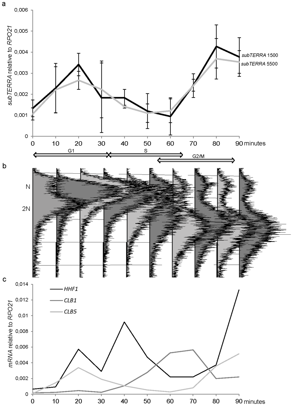 subTERRA accumulate in G1/S phase of the cell cycle. (a) WT bar1∆ cells were grown to exponential phase in YPD medium, diluted and synchronized with alpha-factor. Cells were released into the cell cycle by two subsequent washes with YPD with protease. Time course was performed in fresh YPD at 30 °C during 90 minutes with points at each 10 min. Total RNA was extracted and quantity of subTERRA was quantified using random primer RT and qPCR with specific primer at 1500 (black line) and 5500 bp (dashed line). Our fold accumulation was observed at time point 20 min corresponding to late G1. Experiments were made twice; (b) Cell synchronization was verified by microscopy and, FACS analysis; (c) mRNAs, specific for indicated cell cycle phases were amplified using random primers and quantified by qPCR.