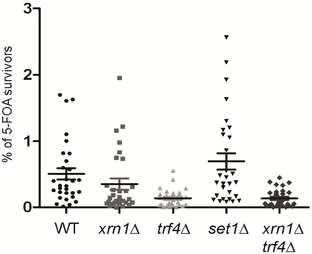 In order to establish a role of subTERRA in telomere maintenance, we studied the effect of RNA decay mutations on TPE (silencing of subtelomeric sequences) [10]. We used native reporter systems with a URA3 reporter gene integrated in non-modified subtelomere Y′ sequences at telomere IXL [61]. The percentage of 5-FOA (5-fluoroorotic acid) survivors, clones efficiently repressing/silencing the URA3 gene present in subtelomeric regions was measured. trf4∆ mutation significantly decreased the percentage of survivors (p-value = 0.00015; Figure 7). This means that the lack of Trf4p leads to less-efficient silencing at subtelomeres. A slight, but not significant effect (p-value = 0.21112) of decrease in TPE was also observed in the xrn1∆ strain but no synergy could be seen for the double xrn1∆ trf4∆ strain, suggesting that these mutations are epistatic (p-value = 0.00014; Figure 7). The possibility that observed phenotypes are biased by nucleotide metabolism and do not reflect silencing efficiency but metabolic changes caused by studied mutation [62] cannot be excluded. We have tried to address this possibility by testing different trf4∆ and xrn1∆ strains for their sensibility at 5-FOA-containing medium, independently of subtelomeric reporter expression. No defect of growth was observed on standard 5-FOA concentrations (0.2%–0.24%, data not shown).