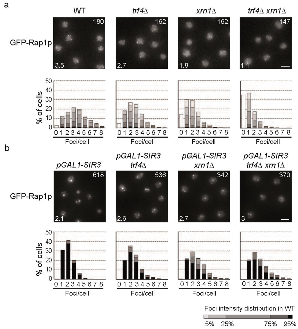 The xrn1∆ strain, accumulating specifically subTERRA-XUTs is defective for telomeric clustering. (a) GFP-Rap1p foci grouping in RNA decay mutants. Representative fluorescent images of the telomere-associated protein Rap1 tagged with GFP of the WT, xrn1∆, trf4∆ and xrn1∆ trf4∆ strains. Cells were grown in galactose overnight, diluted to OD600nm = 0.2, and imaged at OD600nm = 1. White number in upper right corner = mean intensity of detected foci; white number in bottom left corner = mean number of detected foci. Images were quantified using Q-foci application [35]. Gray levels are set to represent the distribution of foci intensity in wild type cells. Bars, 2 μm; (b) Hypercluster formation mediated by Sir3p overexpression is less efficient in RNA decay mutants. Experiment performed as in 8a, but strains were grown in galactose to induce pGAL-SIR3 [35].