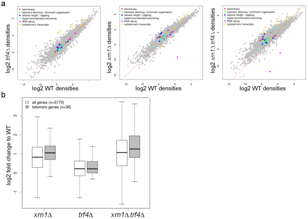 xrn1∆ and trf4∆ impact the general transcription profile but do not change specifically expression of genes important for telomere maintenance. (a) Expression of different classes of genes implicated in telomere maintenance in wild type, trf4∆, xrn1∆ and xrn1∆ trf4∆ cells shown as scatter plot of tag density for selected genes in wild type strain vs. xrn1∆, trf4∆ and xrn1∆ trf4∆ strain. Results are presented as log2 of density, expressed in tag per nucleotide; (b) Global expression of all protein coding and telomere-maintenance in mutants deleted for RNA decay factors (group of 36 genes). Box plot representation of expression fold change for all protein-coding (white) and telomeric (gray) genes in wild type, xrn1∆ and trf4∆ mutants. The black line within the box corresponds to the median value; the top and bottom lines correspond to the upper quartile and lower quartile, respectively.