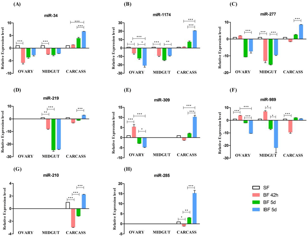 Expression and regulation of miRNAs in different tissues of mosquitoes. Regulation of miRNAs was considered significant with * p < 0.05 (** p < 0.01, *** p < 0.001). Expression and regulation of miRNAs was studied in ovary, midgut and carcass tissue of sugar fed (SF), female mosquito at 42 h (BF 42 h) and 5 days (BF 5d) post blood-feeding and mosquitoes at 5 days post Plasmodium infection (iBF 5d). Sample in parenthesis indicates the experimental condition with which expression was compared to in a particular tissue of mosquito.