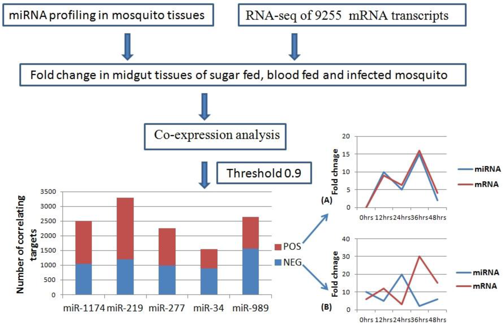 Workflow of miRNA and mRNA co-expression analysis. MicroRNA expression profile in mosquito midgut generated by real time profiling was taken as input data. RNA-Seq data of 9255 transcripts was used as second input data set. These two data sets were used to analyze miRNA: mRNA co-expression (Threshold = 0.9) in the midgut of the female mosquito. Bar graph depicts number of mRNAs showing positive (Red) and negative (Blue) correlation with miR-1174, miR-219, miR-277, miR-34, and miR-989, respectively in the mosquito midgut. (A) Line graph showing positive correlation between miRNA and mRNA over the time period of 0–48 h; (B) Line graph showing negative correlation between miRNA and mRNA over the time period of 0–48 h.
