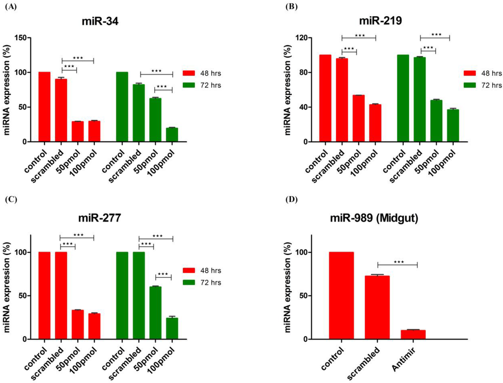 Knockdown of miRNA expression by antagomirs. Knock-down of (A) miR-34; (B) miR-219 and (C) miR-277 expression in cells transfected with 50 pmol and 100 pmol of antagomirs. MicroRNA expression was profiled by RT-PCR at 48 h and 72 h post-transfection in control, scrambled RNA and antagomir transfected cells. Control transfected cells were used as a calibrator, in which expression (%) of miRNA was taken as 100; (D) Knock-down of miR-989 by nano-injecting miR-989 specific antagomir in female mosquito. MicroRNA expression was profiled in midgut tissue of PBS, scrambled and antagomir injected female mosquito taking PBS injected mosquitoes as calibrator. Expression (%) of miRNA in PBS injected midgut tissue was taken as 100. Values are mean ± s.e.m. of three biological replicates profiled in triplicate reactions. Data was statistically analyzed by one-way ANOVA followed by Tukey’s multiple comparisons test. * p < 0.05 was considered significant (** p < 0.01, *** p < 0.001).