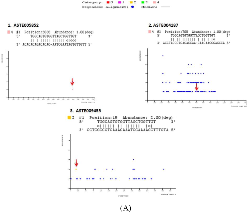 Degradome sequencing for identification of miRNA targets. Sequences reads are mapped on to the entire length of the transcript along with miRNA sequences using PAREsnip. T plots are generated showing abundance of mapped reads along the length of transcript. X-axis represents transcript length whereas Y-axis represents abundance of read mapped on to the specific position on the transcript sequence. Blue dot represents position mapped reads on transcript. Colored dots represent the position on the transcript where mapped degraded fragment (s) coincides with miRNA binding site (S). Identified miRNA targets are categorized in different categories (Category 0, 1, 2, 3, and 4), depending on their relative abundance on mapped position. Positions, where respective miRNA cleaves the transcript, are highlighted by an arrow. T-plots of (A) miR-34, (B) miR-989, (C) miR-219 degradome targets.