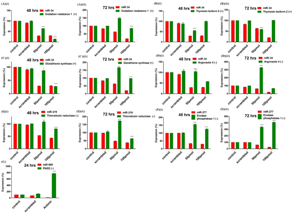 Validation of targets by miRNAs loss of function strategy: Expression profiling of mRNA target(s) of (A–D) miR-34; (E) miR-219 and (F) miR-277 was carried out by RT-PCR in control, scrambled and antagomir transfected cells. Expression (%) of mRNA was compared with miRNA expression at (i) 48 h and (ii) 72 h post-transfection; (G) MiRNA-989 target expression was profiled by RT-PCR in midgut of control, scrambled and miR-989 specific antagomir injected female mosquitoes. Expression (%) of miRNA and mRNA was compared at 24 h post blood-feeding. Expression (%) of mRNAs in control was taken as 100. Values are mean ± s.e.m of three biological replicates profiled in triplicate reaction. Data were statistically analyzed by one-way ANOVA followed by Tukey’s multiple comparisons test. * p < 0.05 was considered significant (** p < 0.01, *** p < 0.001). ns = No significant down-regulation.