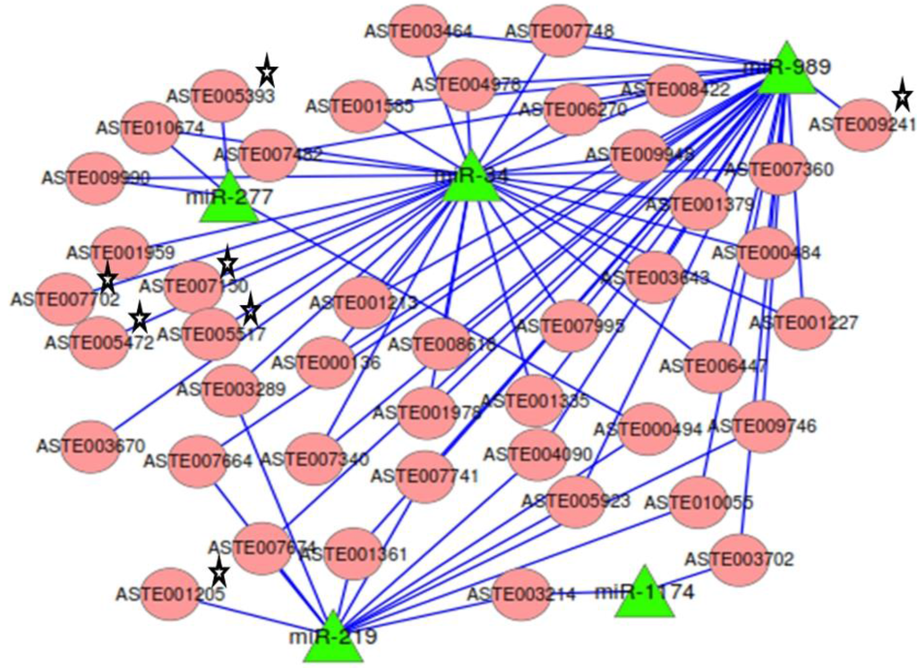 Targets predicted by both RNAhybrid and co-expression analysis, along with degradome targets, were analyzed to identify the ones that were targeted by two or more miRNAs. mRNAs (n = 37) were targeted by two or more miRNA (Table S5). The network of miRNAs and targets functional in mosquito innate immunity and oxidative stress, along with 37 common targets, was generated (Figure 7). Among the 37 common targets, two cleaved mRNAs identified in degradome sequencing were targeted by more than one miRNAs. Target ASTE005923 was commonly degraded by both miR-219 and miR-989 and also contained binding site for miR-989 in its 3′UTR (Figure 7). It is annotated as acyl-CoA binding protein 2 in An.gambiae. Another target ASTE003289 was targeted by both miR-219 and miR-34. It functions as a rotatin protein and is degraded by miR-219 whereas it co-expresses and has binding site for miR-34 in its 3' UTR sequence. Many more targets of significant importance were identified as having binding site and showing co-expression with more than one miRNAs. One such target is ASTE004090, a Ras GTPase-activating protein 3 functional in MAPK signaling pathway, and is targeted by miR-219 and miR-989. Programmed cell death protein ASTE008618 was targeted by miR-34 and miR-989 (Figure 7). A protein functional in innate immunity, clip-domain serine protease, ASTE003643 was targeted by miR-34 and miR-989. Two transcripts, ASTE010674 and ASTE009990, functional in oxidative phosphorylation and endocytosis pathways, were targeted by both miR-34 and miR-277. Genes playing significant role in oxidative stress, such as glutathione synthase (ASTE007702), Oxidation resistance protein (ASTE007150), and Thioredoxin reductase (ASTE001205), were found to be targeted by these miRNAs. Argonaute (ASTE005517), an important component of RNAi machinery, was also found to be targeted by miR-34 in An. stephensi (Figure 7).