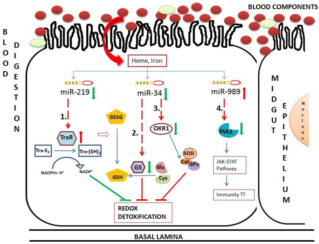 Hypothetical model of oxidative and immunity pathways regulated by miRNAs in midgut tissue of female mosquito post blood feeding. This pathway includes three miRNAs regulated in midgut of blood-fed female mosquito namely miR-34, miR-219 and miR-989. These miRNAs regulate expression of mRNAs, such as (1) Thioredoxin reductase (TrxR); (2) Glutathione synthase (GS); (3) Oxidation resistance 1 (OXR1) and (4) Protein inhibitor of activated STAT (PIAS). Red arrows and green arrows represent up-regulation and down-regulation of the component in midgut cells, respectively. Dotted lines represent miRNA:mRNA interaction validated in this study.