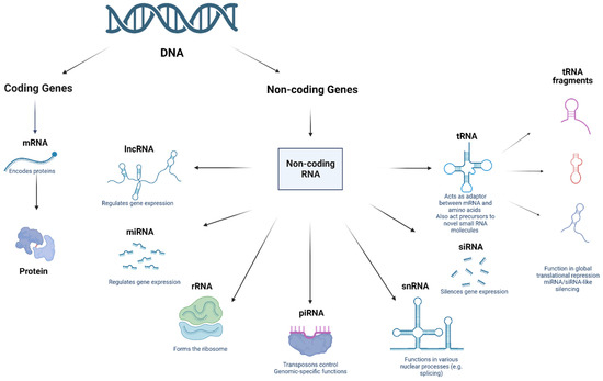 The emergence of small regulatory ncRNAs in the 1980s and 1990s completely shifted the pre-conceived notion of ncRNAs towards functional regulatory molecules [39,40,41,42]. Fire & Mello et al. indicated that double stranded RNAs (dsRNAs) could post-transcriptionally silence the complementary mRNAs in the nematode Caenorhabditis elegans via a process known as RNA interference [43,44]. Shortly afterwards, endogenous dsRNAs, such as small interfering RNAs (siRNAs) and microRNAs (miRNAs), were detected in a plethora of organisms, including plants, flies, and mammals [45]. The most thoroughly investigated classes of regulatory RNAs to date are piwi-associated RNAs, tRNAs, miRNAs, lncRNAs, and circRNAs (Figure 1) [45,46,47,48,49,50,51,52,53,54,55]. The non-coding portion of the mammalian transcriptome outweighs the protein-coding portion. This has been showcased in recently conducted studies, where only a mere 1.9% of the genome encodes for proteins [19,30,56,57,58]. In the coming sections of the review, the authors will focus on introducing the most well-studied ncRNAs.