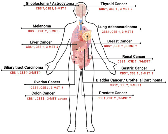 The human 3MST enzyme is encoded by the MPST gene on the long arm of chromosome 22 in the subtelomeric region q13.1 [125]. The MPST gene is 5.6 kbp in length with only two exon regions [126]. Unlike CBS and CSE, 3MST synthesizes H2S using 3-mercaptopyruvate (3-MP)—a product of L-cysteine metabolism by the cysteine aminotransferase (CAT) enzyme in the presence of α-ketoglutarate [127]. One more significant characteristic of 3MST is that it can be detected not only in the cytoplasm in a similar manner to CBS and CSE but also in the mitochondria [127]. Physiologically, 3MST plays a critical role in cellular metabolism and bioenergetics [128]. In recent years, there has been growing interest in the role of 3MST in cancer progression [129]. Some studies have shown that 3MST is upregulated in various types of cancers, as will be discussed later in this review. The expression levels of the three H2S-synthesizing enzymes in several types of cancer are displayed in Figure 3 and Table 1.