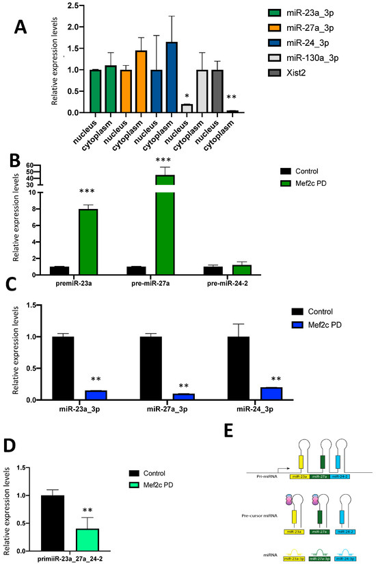 Panel (A) RT-qPCR analyses of the nuclear and cytoplasmic distribution of miR-23a_3p, miR-27a_3p and miR-24_3p mature microRNAs in HL1 cardiomyocytes. Note that all three microRNAs are similarly expressed in the nucleus and cytoplasm in contrast to miR-130a, which is primarily cytoplasmic, and the long non-coding RNA Xist2, which is preferentially nuclear. Panel (B) RT-qPCR analyses of Mef2c pulldown assays for pre-miR-23a, pre-miR-27a and pre-miR-24, respectively. Note that increased levels are observed for pre-miR-23a and pre-miR-27a but not for pre-miR-24. Panel (C) RT-qPCR analyses of Mef2c pulldown assays for mature miR-23a_3p, miR-27a_3p and miR-24_3p, respectively. Note that none of the mature microRNAs are increased after Mef2c pulldown assays. Panel (D) RT-qPCR analyses of Mef2c pulldown assays for pri-miR-23-miR-27a-miR-24-2. Panel (E) Schematic representation of the Mef2c association with the miR-23a-miR-27a-miR-24-2 clustered microRNAs. All data are normalized to Gapdh for mRNA expression analyses and to 5S for microRNA expression analyses. * p < 0.05, ** p < 0.01, *** p < 0.001.