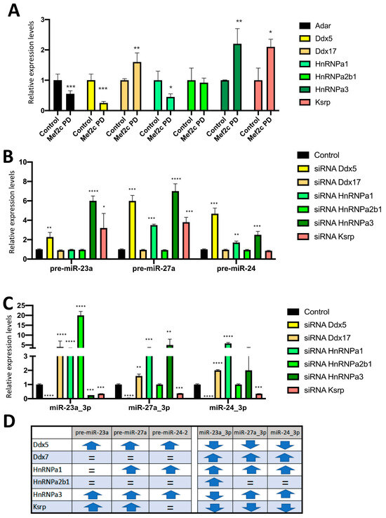 Panel (A) RT-qPCR analyses of Mef2c pulldown assays for RNPs in HL1 cardiomyocytes. Note that increased levels for Ddx17, HnRNPa3 and Ksrp are observed. Panel (B) RT-qPCR analyses of pre-miR-23a, pre-miR-27a and pre-miR-24-2 expression after silencing each of the RNPs previously tested in HL1 cardiomyocytes, respectively. Note that silencing Ddx5 and HnRNPa3 enhanced the expression of all pre-microRNAs while silencing Ksrp only upregulated pre-miR-23a and pre-miR-27a but not pre-miR-24-2. Panel (C) RT-qPCR analyses of mature miR-23a_3p, miR-27a_3p and miR-24_3p expression after silencing each of the RNPs previously tested in HL1 cardiomyocytes, respectively. Note that silencing Ddx5 and Ksrp decreased the expression of all pre-microRNAs while silencing HnRNPa2b1 selectively upregulated only pre-miR-23a. Panel (D) Schematic representation of the effects of RNP silencing on miR-23a-miR-27a-miR-24-2 pre-miRNA and mature microRNA expression, respectively. All data are normalized to Gaped for mRNA expression analyses and to 5S for microRNA expression analyses. * p < 0.05, ** p < 0.01, *** p < 0.001, *** p < 0.0001.