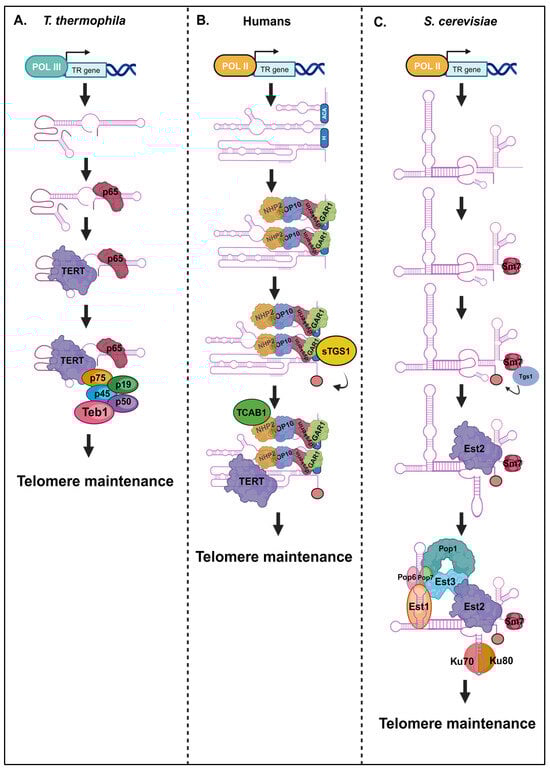 An abbreviated pathway for TR processing and biogenesis exists in the free-living ciliate, T. thermophila [16]. In these unicellular eukaryotes, the TR gene is transcribed by RNA polymerase III [6]. Other TR molecules in land plants and lower plants have also been shown to be transcribed by RNA POL III, like T. thermophila [35,36,68]. This broad conservation in transcription by way of RNA POL III suggests that ciliate and plant TRs share a common origin. This RNA POL III transcription of TR genes was also recently identified in Hymenoptera and Lepidoptera insects [69]. These recent findings demonstrate the wide expansion of RNA POL-III-mediated transcription factors of TR genes across a diverse set of eukaryotic clades. The acquisition of an RNA POL III biogenesis pathway in diverse eukaryotic clades may have arisen due to convergent evolution. The conservation of similar traits in distantly related organisms may have arisen due to the universal function of telomerase that is essential for telomere maintenance across a variety of eukaryotic organisms. Other eukaryotic TR genes include RNA polymerase II transcripts [70]. Following the transcription of the T. thermophila TR gene, the RNA chaperone p65 will bind to and fold the TR in an active conformation for TERT binding [42,43,44]. After the TERT has been associated with the TR, p45, p75, p19, p50, and Teb1 can bind to form the complete telomerase holoenzyme required for telomerase activity and telomere maintenance in these ciliates (Figure 1A). Thus, the proper folding of the TR molecule is critical in order to promote interactions with the TERT protein and it also facilitates the early steps in TERT-TER assembly [71]. Recent studies have also defined the structural and functional requirements of TR and TERT interactions for telomere recruitment and the activation of telomerase in various species. For example, in human telomerase–telomere interactions, shelterin protein TPP1 forms a structured interface with the TERT-specific essential N-terminal elements to promote telomerase activation. This study also uncovered unique TERT–TER interactions that regulate telomerase activity [72]. In fact, methods like the comprehensive identification of RNA-binding proteins via mass spectrometry (ChIRP-MS) are now successfully adopted for plant models to determine TR-interacting partners akin to mammalian telomerase [73].