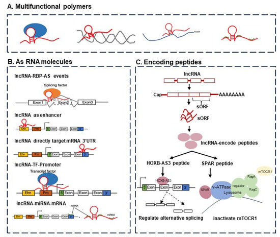 Long non-coding RNAs are essential players in many cellular processes, from regular development to oncogenic transformation. Figure 1 provides a schematic view of the functions of lncRNAs. The rapid growth of genome-wide translation profiling and ribosome profiling has revealed that a number of small open reading frames (sORFs) within ncRNAs actually have peptide- or protein-coding potential [1,2]. The peptides or short proteins encoded by transcripts annotated as lncRNAs have been shown to be critical players in cancer development and progression. For example, a conserved 53 aa peptide encoded by the putative lncRNA HOXB-AS3 suppresses colon cancer growth by regulating the alternative splicing of pyruvate kinase M (PKM) and tumor metabolic reprogramming [1,3]. FBXW7-185aa is encoded by the circRNA FBXW7 and inhibits glioma growth [4]. Moreover, miPEP-200a and miPEP-200b are encoded by miR-200a and miR-200b, and respectively, inhibit the migration of prostate cancer cells via the suppression of the process of epithelial-to-mesenchymal transition [5].