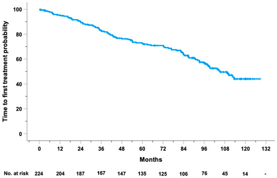 Kaplan–Meier curve of TTFT in the 224 CLL cases from our prospective O-CLL1 study.