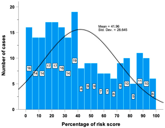 Risk score histogram distribution of 224 cases from O-CLL1 study based on the 16 miRNAs significantly associated with TTFT in multivariate Cox regression model.