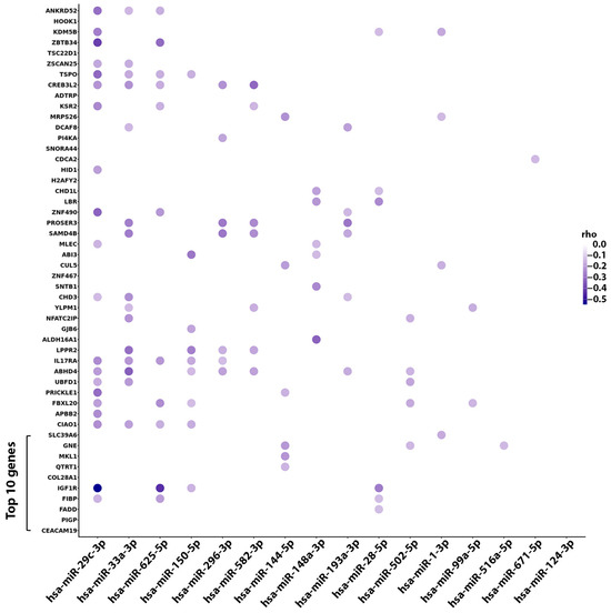 Dot plot displaying the magnitude of negative correlation between the 16 miRNAs significantly associated with TTFT in the 224 CLL cases from our prospective O-CLL1 study and the 50 AI genes from the same cohort. AI genes are sorted by significance magnitude from the bottom to the top. The first 10 genes represent the top AI-based selected genes that were significantly associated with TTFT. The greater intensity of the color in the circle shapes corresponds to a higher magnitude of the negative correlation measured by a Spearman test. rho (or Spearman’s correlation coefficient, measured using a Spearman test) is a non-parametric measure that evaluates the strength and direction of a monotonic relationship between two ordinal or quantitative variables using the ranks of the observations instead of their absolute values.