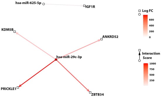 Interaction analysis between miRNAs and genes which were found to be associated with TTFT. Interaction networks between has-miR-29c-3p with 4 AI genes ANKRD52, KDM5B, PRICKLE1, and ZBTB34 or hsa-miR-625-5p with IGF1R are shown. Arrows, circles, and squares indicate the miRNA–mRNA interaction scores, miRNA, and mRNA log-transformed fold-change (Log FC), respectively. Log FC values for miRNA (◯) and mRNA (□) are indicated by a color gradient scale. Regulation score parameter values related to the IGHV mutational status (arrows) are highlighted by a scale color gradient from light gray that represents a midpoint value of 0 to red that indicates positive values (interaction score).