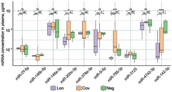 - Nicoletti, A.d.S.; Visacri, M.B.; da Ronda, C.R.d.S.C.; Vasconcelos, P.E.d.N.S.; Quintanilha, J.C.F.; de Souza, R.N.; Ventura, D.d.S.; Eguti, A.; Silva, L.F.d.S.; Perroud Junior, M.W.; et al. Differentially Expressed Plasmatic MicroRNAs in Brazilian Patients with Coronavirus Disease 2019 (COVID-19): Preliminary Results. Mol. Biol. Rep. 2022, 49, 6931–6943. [Google Scholar] [CrossRef]