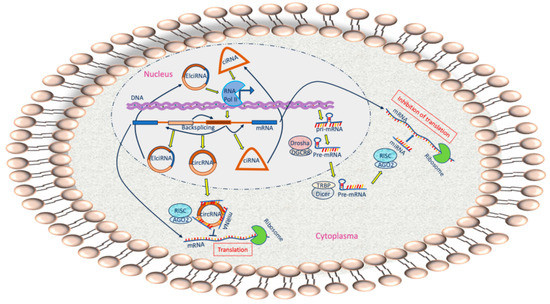 CircRNAs are usually expressed at low levels. However, one gene can produce multiple circRNAs. Because of their circle formation, they are more resistant to exonucleases than linear RNAs. As miRNAs, they circulate in the bloodstream and can be transported by exosomes [38]. They either promote gene transcription by binding to DNA polymerase II or inhibit mRNA translation. However, the majority of circRNAs regulate the gene expression by sponging miRNAs, serving as ceRNAs. Thus, circRNAs inhibit miRNA activity by competing binding sites [14,39]. They can also directly interact with circRNA-binding proteins; hence, they can regulate the translocation of certain proteins [40].