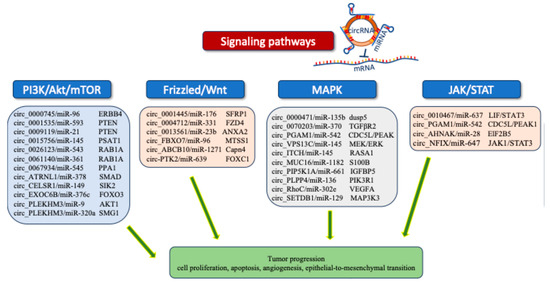 Thus, circRNAs sponge miRNAs; therefore, they abrogate the binding of miRNAs to their targets in important cancer-associated signaling pathways leading to tumor progression.