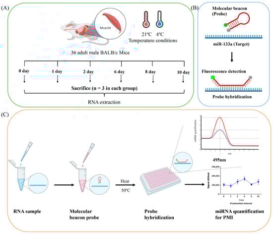 Schematic illustration for detection of mmu-miR-133a-5p using MB to assess PMI. (A) Thirty-six healthy adult male BALB/c mice were randomly divided into six groups based on different PMI intervals (0, 1, 2, 6, 8, and 10 days), with each group containing three mice. The mice were exposed to two temperature conditions (4 °C and 21 °C). Skeletal muscle tissues were collected from each mouse, homogenized with TRIzol reagent, and total RNA was extracted. (B) The MB probe was engineered for optimal thermodynamic stability in its hairpin structure, but it unfolds in the presence of mmu-miR-133a. (C) Steps of the MB probe assay for quantifying mmu-miR-133a. Created in Biorender.