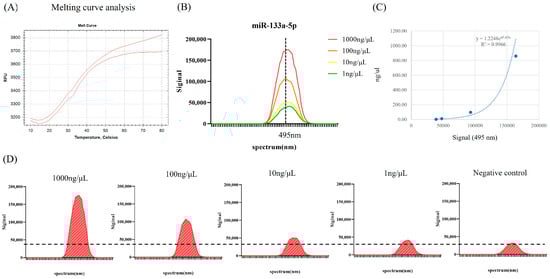 Analytical performance of molecular beacon probe assay for mmu-miR-133a-5p. (A) Melt curve of the molecular beacon probe for mmu-miR-133a-5p. (B) The fluorescence spectra of the molecular beacon probe in response to varying concentrations of synthetic mmu-miR-133a. (C) The standard curve between fluorescence intensity versus the target miRNA concentration. (D) Detection limits of the molecular beacon probe assay for mmu-miR-133a-5p using 10-fold serial dilutions of synthetic miR-133a-5p (from 1 ng/μL to 1000 ng/μL). The dotted line represents the limit of detection.