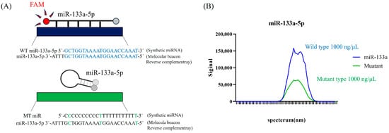 Specificity of the molecular beacon probe assay for mmu-miR-133a-5p. (A) A graphical comparison of wild-type and mutant miR-133a-5p used to assess the specificity of the molecular beacon probe assay for mmu-miR-133a-5p. (B) The fluorescence spectra of the molecular beacon probe in reactions with wild-type and mutant miR-133a-5p.