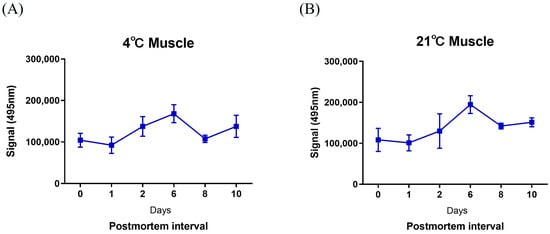 The levels of mmu-miR-133a-5p were assessed using the MB in the skeletal muscle tissues of 36 adult male BALB/c mice to evaluate their effectiveness for identifying prolonged postmortem intervals (PMIs) ranging from 0 to 10 days (0, 1, 2, 6, 8, and 10 days; Figure 4). The expression of mmu-miR-133a remained consistent in skeletal muscle tissue at both low (4 °C) and high (21 °C) temperatures.