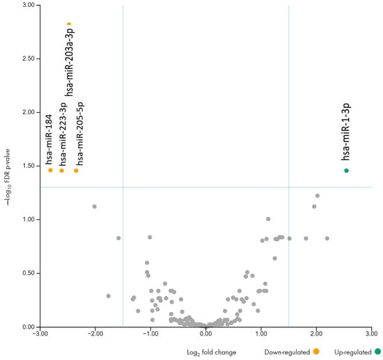 In total, 431 miRNAs were detected in the first trimester and 499 in the second trimester. Among all miRNAs identified in the first trimester, five were differentially expressed: there were four microRNAs with decreased expression (hsa-miR-184, hsa-miR-203a-3p, hsa-miR-205-5p, hsa-miR-223-3p) and one microRNA with increased expression (hsa-miR-1-3p) in the urine samples of patients who later developed PE (FDR < 0.05, |log2FC| > 1.5) (Table 2, Figure 1).