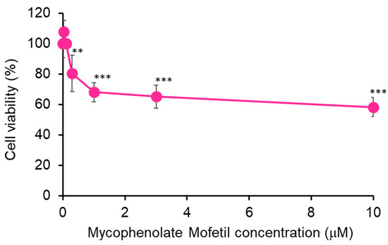 Inhibition of cell proliferation by MPM in HEPM cells. Proliferation of HEPM cells treated with MPM (0.01, 0.03, 0.1, 0.3, 1, 3, and 10 μM) for 48 h. Data are presented as the mean ± standard deviation (SD). ** p < 0.01, and *** p < 0.001 versus control (n = 6).