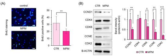 MPM-induced cell proliferation is associated with G1 arrest in HEPM cells. (A) BrdU staining (green) of HEPM cells after treatment with 1 μM MPM for 48 h. The nuclei were counterstained with Hoechst 33342 (blue). Scale bar, 50 μm. The graph shows the quantification of BrdU-positive cells. Data are presented as the mean ± standard deviation (SD). ** p < 0.01 (n = 6). (B) Western blotting of HEPM cells treated with 1 μM MPM for 48 h. β-ACTIN was used as an internal control. * p < 0.05, ** p < 0.01, *** p < 0.001 (n = 3).