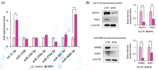 MPM upregulated let-7c-5p and miR-4680-3p in HEPM cells. (A) Quantitative RT-PCR of let-7c-5p, miR-133b, miR-140-5p, miR-193a-3p, miR-374a-5p, miR-381-3p, and miR-4680-3p after treatment of HEPM cells with 1 μM MPM for 48 h. Data are presented as the mean ± standard deviation (SD). ** p < 0.01 and *** p < 0.001 (n = 3). (B) Western blotting of HEPM cells treated with 1 μM MPM for 48 h. β-ACTIN was used as an internal control. * p < 0.05, ** p < 0.01, *** p < 0.001 (n = 3).