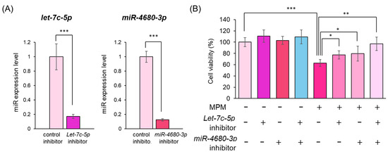 Inhibition of let-7c-5p and miR-4680-3p alleviated MPM-induced cell proliferation inhibition in HEPM cells. (A) Quantitative RT-PCR analysis of let-7c-5p or miR-4680-3p expression after transfecting HEPM cells with let-7c-5p inhibitor or miR-4680-3p inhibitor for 24 h. Data are presented as the mean ± standard deviation (SD). *** p < 0.001 (n = 3). (B) Proliferation of HEPM cells treated with 1 μM MPM and/or let-7c-5p inhibitor and/or miR-4680-3p inhibitor for 48 h. Data are presented as the mean ± standard deviation (SD). * p < 0.05, ** p < 0.01, and *** p < 0.001 (n = 6).