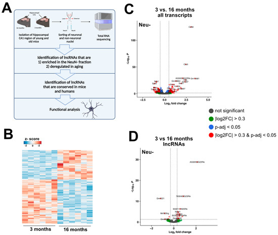 Aging induces changes in glial lncRNA expression patterns. (A) Schematic illustration of the experimental approach of this study. (B) Heatmap showing gene expression changes in Neu– nuclei isolated in 3- vs. 16-month-old mice. (C) Volcano plot showing the up- and downregulated coding transcripts when comparing Neu– nuclei from 3 vs. 16-month-old mice (log2fold changes are depicted as 16/3 months). (D) Volcano plot showing expression changes in lncRNAs in Neu– nuclei (log2fold changes are depicted as 16/3 months).