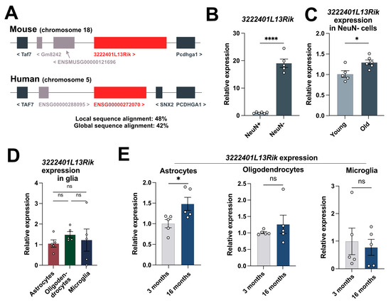 Next, we compared the list of lncRNAs deregulated during aging (n = 24) with those enriched in the NeuN− fraction (n = 51). To facilitate the translation of our findings to human studies, we focused on lncRNAs with human homologs. Among the 24 deregulated lncRNAs in 16-month-old mice, seven were significantly enriched in the NeuN− fraction compared to NeuN+ nuclei (log2FC > 4, padj < 0.05), with only three having human homologs. These included nuclear enriched abundant transcript 1 (Neat1) and 3222401L13Rik, both upregulated in 16-month-old mice, and C430049B03Rik, which was downregulated (Table 1). Since Neat1 has been extensively studied, particularly concerning its role in astrocytes [25], and C430049B03Rik has been analyzed as a host gene for miR-322, miR-503, and miR-531 in mouse embryonic fibroblasts [29], we chose to focus our study on 3222401L13Rik, a lncRNA that has not been previously characterized in any organ.
