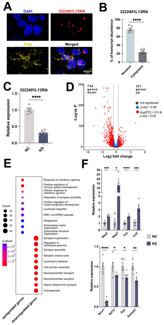 We found that 3222401L13Rik is primarily expressed in the nucleus, which aligns with the known role of lncRNAs in gene expression control [13]. Consistent with this, we observed that the knockdown of 3222401L13Rik in primary mouse astrocytes led to significant changes in gene expression, including upregulation of inflammatory processes and a downregulation of genes associated with neuronal support functions. This finding is consistent with previous studies showing that lncRNAs can have profound effects on astrocytic gene expression control [22,25].