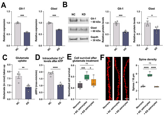 The KD of 3222401L13Rik affects glutamate uptake, Ca2+ signaling, and the support of neuronal function. (A) qPCR showing the expression levels of the glutamate transporters Glt-1 and Glast after the KD of 3222401L13Rik in primary astrocytes (unpaired t-test; *** p < 0.001). (B) Left panel: Representative immunoblot images of Glt-1 and Glast following the KD of 3222401L13Rik. in primary astrocytes. Right panel: Quantification of the left panel (unpaired t-test; * p < 0.05, *** p < 0.001). (C) Glutamate uptake of primary astrocytes after the KD of 3222401L13Rik (unpaired t-test; ** p < 0.01). (D) Increase in intracellular Ca2+ levels in response to ATP treatment after the KD of 3222401L13Rik (unpaired t-test; **** p < 0.0001). (E) Survival of neurons after treatment with 100 µM glutamate cultured alone or co-cultured with NC or KD astrocytes (One-way ANOVA; * p < 0.05, *** p < 0.001, ns = not significant). (F) Left panel: Representative images of dendrite and spine labeling of neurons cultured alone or co-cultured with NC or KD astrocytes. Right panel: Quantification of spines shown in the left panel (One-way ANOVA; **** p < 0.0001; ns = not significant). Data are depicted as mean ± standard error. NC: negative control. KD: knockdown.