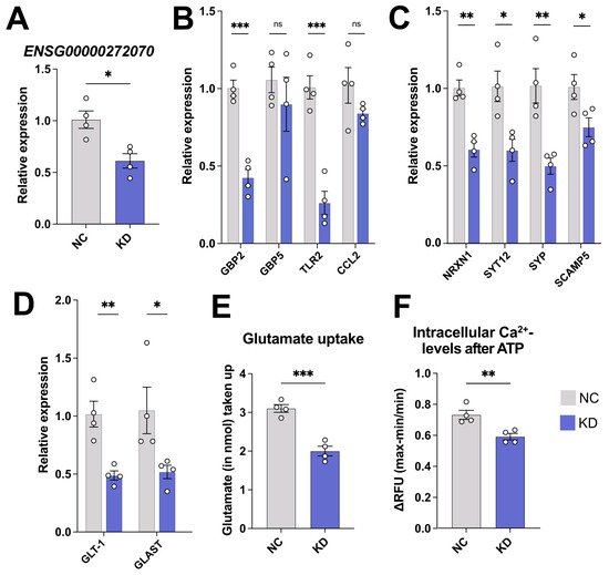 The synaptic support functions of 3222401L13Rik are conserved in human astrocytes. (A) KD of ENSG00000272070 in human iPSC-derived astrocytes (unpaired t-test; * p < 0.05). (B) Expression levels of interferon response genes after the KD of ENSG00000272070 in human iPSC-derived astrocytes (unpaired t-test; *** p < 0.001; ns = not significant). (C) Expression levels of genes associated with synaptic support after the KD of ENSG00000272070 in human iPSC-derived astrocytes (unpaired t-test; * p < 0.05; ** p < 0.01). (D) qPCR showing the expression of the glutamate transporters GLT-1 and GLAST after the KD of ENSG00000272070 in human iPSC-derived astrocytes (unpaired t-test; * p < 0.05; ** p < 0.01). (E) Glutamate uptake after the KD of ENSG00000272070 (unpaired t-test; *** p < 0.001). (F) Increase in intracellular Ca2+ levels in response to ATP stimulation after the KD of ENSG00000272070 (unpaired t-test; ** p < 0.01). Data are depicted as mean ± standard error. NC: negative control. KD: knockdown.