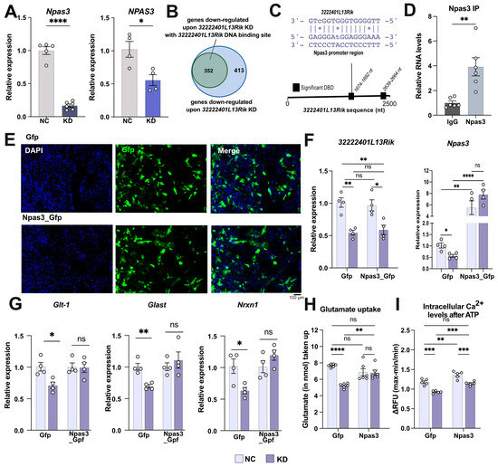 The overexpression of the interaction partner Npas3 can rescue molecular and functional changes induced by the loss of 3222401L13Rik. (A) qPCR showing the expression levels of Npas3/NPAS3 in mouse (left panel) and human iPSC-derived (right panel) astrocytes after the KD of 3222401L13Rik (unpaired t-test; * p < 0.05, **** p < 0.0001). (B) Venn diagram showing the proportion of downregulated genes (352 out of 765) containing a promoter region that can bind 3222401L13Rik. The Triplex Domain Finder tool [39] was used to identify promoter regions of the downregulated genes that have a binding motif for 3222401L13Rik. (C) Scheme depicting the significant DNA binding domains (DBD) in the sequence of 3222401L13Rik determined using the Triplex Domain Finder tool and the sequence motifs where 3222401L13Rik binds to the promoter of Npas3. (D) RNA immunoprecipitation for Npas3, followed by qPCR for 3222401L13Rik in mouse primary astrocytes (unpaired t-test; ** p < 0.01). (E) Representative immunofluorescence images showing the transfection of primary astrocytes with Gfp- or Gfp-Npas3-overexpression plasmids. Scale bar: 100 µm. (F) Expression levels of 3222401L13Rik and Npas3 after the simultaneous KD of 3222401L13Rik and overexpression of Npas3 in primary astrocytes (One-way ANOVA; * p < 0.05; ** p < 0.01; **** p < 0.0001; ns = not significant). (G) Expression levels of Glt-1, Glast, and Nrxn1 after the simultaneous KD of 3222401L13Rik and overexpression of Npas3 in primary astrocytes (One-way ANOVA; * p < 0.05; ** p < 0.01; ns = not significant). (H) Glutamate uptake of primary astrocytes after the simultaneous KD of 3222401L13Rik and overexpression of Npas3 (One-way ANOVA; ** p < 0.01; **** p < 0.0001; ns = not significant). (I) Increase in intracellular Ca2+ levels in response to ATP stimulation after the simultaneous KD of 3222401L13Rik and overexpression of Npas3 (One-way ANOVA; ** p < 0.01; *** p < 0.001; ns = not significant). Data are depicted as mean ± standard error. NC: negative control. KD: knockdown.