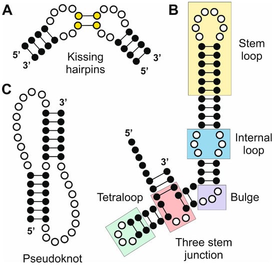 Selected RNA elements generated by secondary and tertiary structure arrangements with relevance in the biogenesis and function of ncRNAs. (A) Kissing hairpins; (B) combined RNA segment that contains a stem loop, and internal loop, a bulge, a three-stem junction and a tetraloop; and (C) pseudoknot.