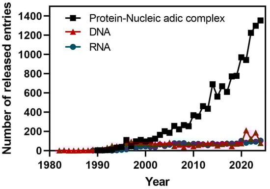 Time course of the deposition statistics in the PDB database showing the number of released entries by year for protein–nucleic acid complexes, and for DNA and RNA molecules (source: PDB statistics).