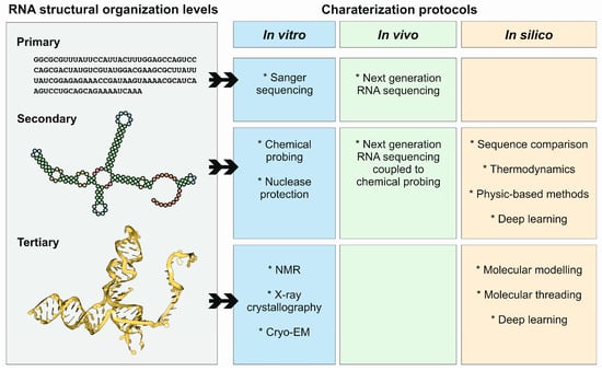Structural organization levels of RNA molecules, and protocols used for their characterization, in vitro, in vivo, and in silico. Note that the different protocols and methods are highly connected, and in many cases are used together as synergistic approaches.