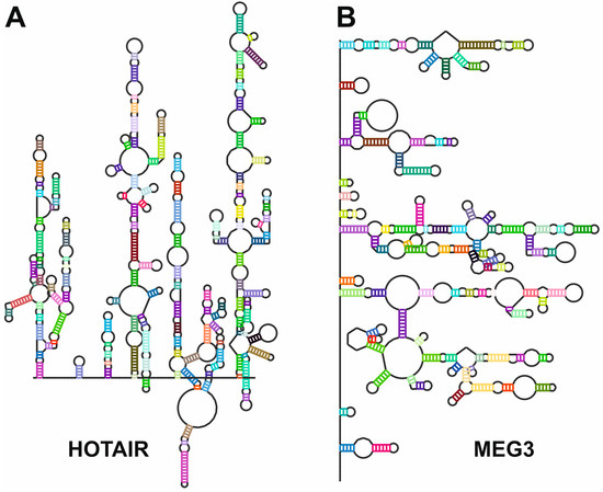 Secondary structures of (A), HOTAIR [108] and (B), MEG3 [56] lncRNAs as determined by chemical probing followed by next-generation sequencing. Sequences and secondary structures were retrieved from the lncRNA-folding repository [109]. Secondary structure maps were generated by the RNArtist software v.1.0 (https://github.com/fjossinet/RNArtist, accessed on 31 January 2025).