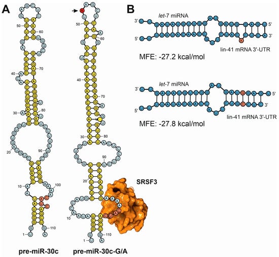 Examples of secondary structure predictions applied to the study of the influence of sequence variants in the functions of ncRNAs. (A) Fernández and coworkers used a combination of in silico prediction techniques with experimental validation to demonstrate the differences in the processing efficiency of miRNA precursors induced by single point mutations [123]. This depiction shows the computer predictions of the secondary structure of the human pre-miR-30c canonical precursor (pre-miR-30c) compared to the A52G mutant (pre-miR-30c-G/A, mutation position depicted by an arrow). In the mutated precursor, the base of the loop presents an open structure that exposes the CNNC canonical sequence for SRSF3 binding, ensuring a more efficient processing by the nuclear DGCR8-Drosha complex. (B) Detailed analysis of the computer predictions of miRNA–mRNA hybrids established between let-7 miRNA and lin-41 3′-UTR, showing the differences in the estimated Gibbs function in two miRNA targets according to the presence of sequence bulges generated by sequence variants [124].
