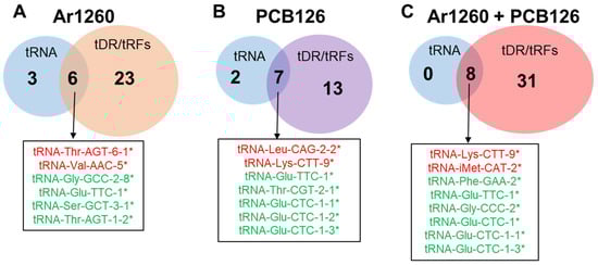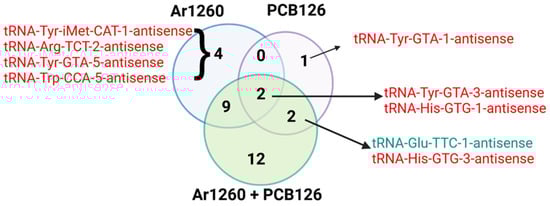 The impact of PCB exposures on tRNA-antisense abundance. The colors red and green indicate increased or decreased tRNA-antisense expression in the liver samples as indicated. The data are in the Supplementary Tables S1–S3. The Venn diagram was finalized using BioRender.com (accessed on 27 March 2025).