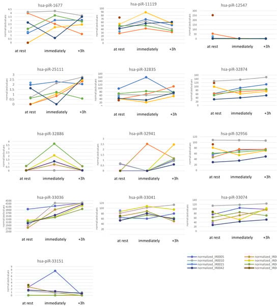 - Widmann, M.; Mattioni Maturana, F.; Burgstahler, C.; Erz, G.; Schellhorn, P.; Fragasso, A.; Schmitt, A.; Nieß, A.M.; Munz, B. miRNAs as Markers for the Development of Individualized Training Regimens: A Pilot Study. Physiol. Rep. 2022, 10, e15217. [Google Scholar] [CrossRef] [PubMed]
