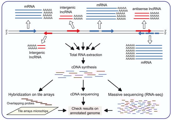Figure 1. Procedures most frequently used for the detection of lncRNAs. Open and black arrows represent PolII transcription and experimental steps, respectively. Protein-coding sequences are indicated in blue. The two major classes of lncRNAs, antisense and intergenic, are represented in red.